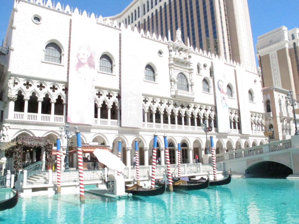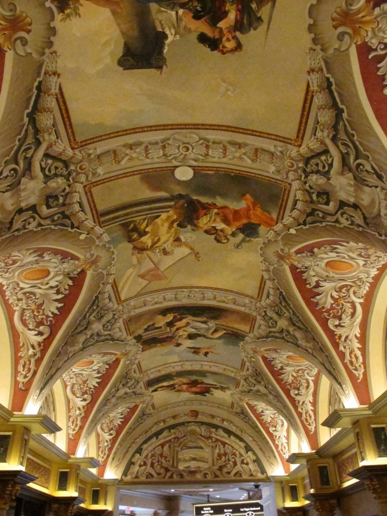 The Venetian had plenty of arched bridges overlooking the canals both inside and outside the building. The ceiling and the stairs had fine Italian detailing right from the paintings to the carvings and sculptures. The Grand Canal Shoppes had a falsified ceiling to mock the look of a clear blue sky. Occasionally, a gondola would pass by the shoppers carrying bags from Burberry and Coach almost luxuriously transporting us across several time zones. Just when I thought that nothing could top that scene, we came across some pizza and gelato stores. It was the icing on the cake!