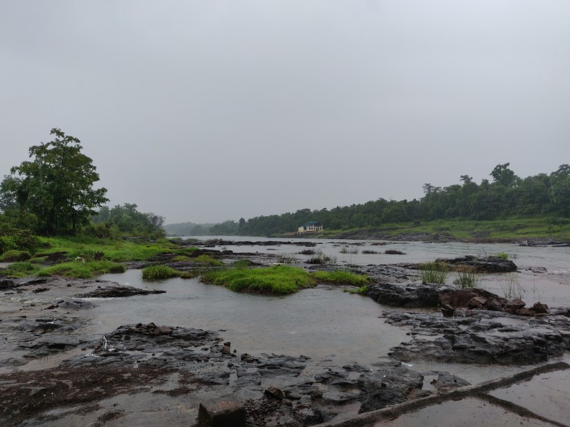 A few women were washing clothes by the small dam constructed on the river, but that water only drained in the central part of the river. The river was wide and the water flowing on the sides was pristine. With our footwear in our hand, we jumped over a few rocks and waded through the water to reach a spot in the stream where pace of the water packed enough fun but was not risky at the same time. We plopped our belongings on the patch of steady ground near us and immersed ourselves into the magic that the rushing water brought with it. We were hit by water on all sides, including from the top, since the dark clouds which were holding back till we settled in, had finally given in.